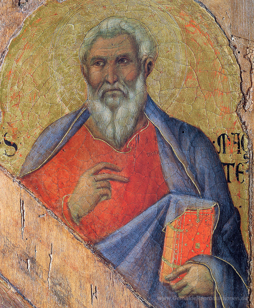 Wir bieten Ihnen eine handgefertigte Reproduktion auf Leinwand des berühmten Kunstwerks 'Der Apostel Matthäus' von Duccio, aus dem Reproduktionsmuseum.