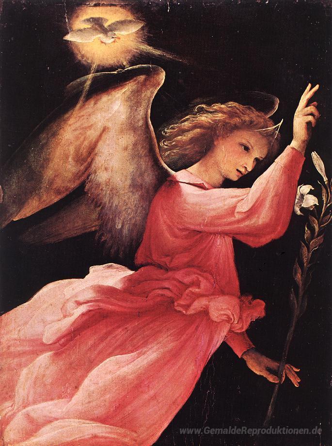 Wir bieten Ihnen eine handgefertigte Reproduktion auf Leinwand des berühmten Kunstwerks 'Der Engel der Verkündigung' von Lorenzo Lotto, aus dem Reproduktionsmuseum.