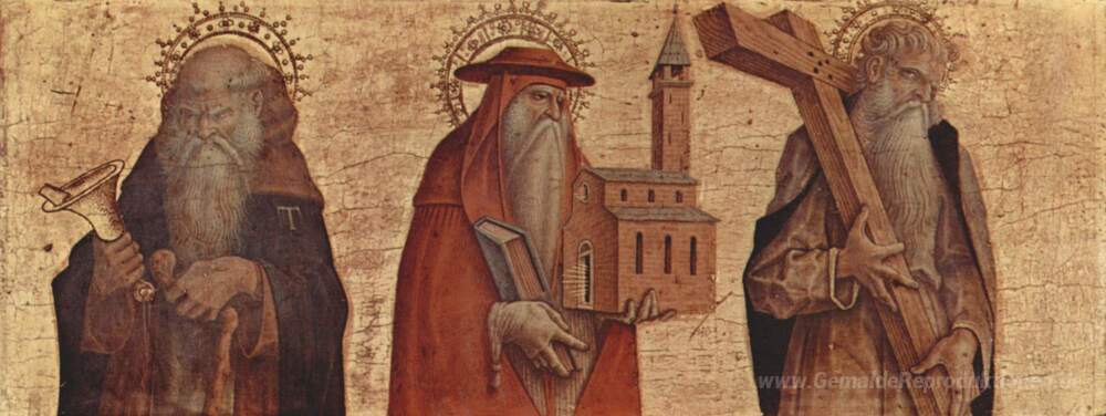 Wir bieten Ihnen eine handgefertigte Reproduktion auf Leinwand des berühmten Kunstwerks 'Der Heilige Antonius, St. Jerome, St. Andrew' von Carlo Crivelli, aus dem Reproduktionsmuseum.