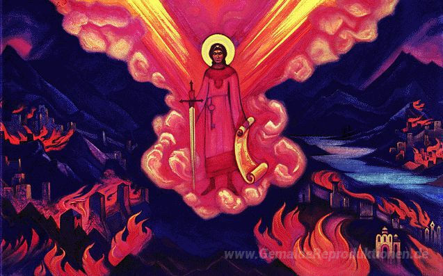 Wir bieten Ihnen eine handgefertigte Reproduktion auf Leinwand des berühmten Kunstwerks 'Der letzte Engel' von Nicholas Roerich, aus dem Reproduktionsmuseum.