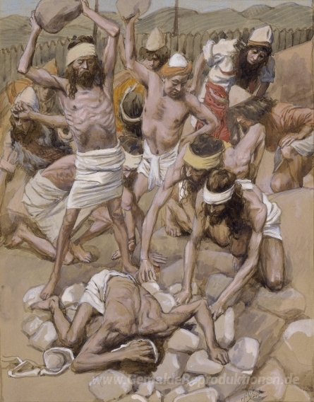 Wir bieten Ihnen eine handgefertigte Reproduktion auf Leinwand des berühmten Kunstwerks 'Der Sabbat Breaker Stoned' von James Tissot, aus dem Reproduktionsmuseum.