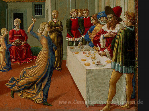 Wir bieten Ihnen eine handgefertigte Reproduktion auf Leinwand des berühmten Kunstwerks 'Der Tanz der Salome (Detail)' von Benozzo Gozzoli, aus dem Reproduktionsmuseum.