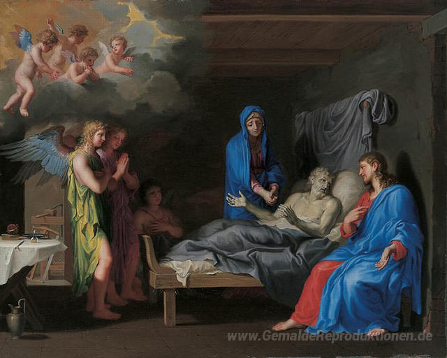 Wir bieten Ihnen eine handgefertigte Reproduktion auf Leinwand des berühmten Kunstwerks 'Der Tod des heiligen Josef' von Jacques Stella, aus dem Reproduktionsmuseum.