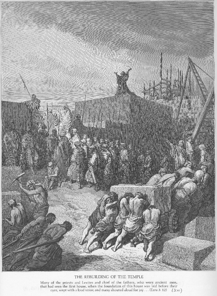 Wir bieten Ihnen eine handgefertigte Reproduktion auf Leinwand des berühmten Kunstwerks 'Der Wiederaufbau des Tempels begonnen' von Gustave Dore, aus dem Reproduktionsmuseum.