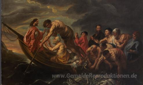 Wir bieten Ihnen eine handgefertigte Reproduktion auf Leinwand des berühmten Kunstwerks 'Der wunderbare Fischzug' von Jacob Jordaens, aus dem Reproduktionsmuseum.