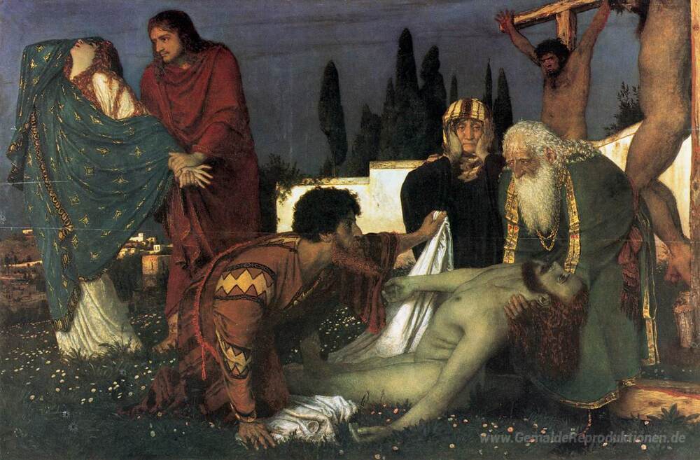 Wir bieten Ihnen eine handgefertigte Reproduktion auf Leinwand des berühmten Kunstwerks 'Die Absetzung' von Arnold Böcklin, aus dem Reproduktionsmuseum.
