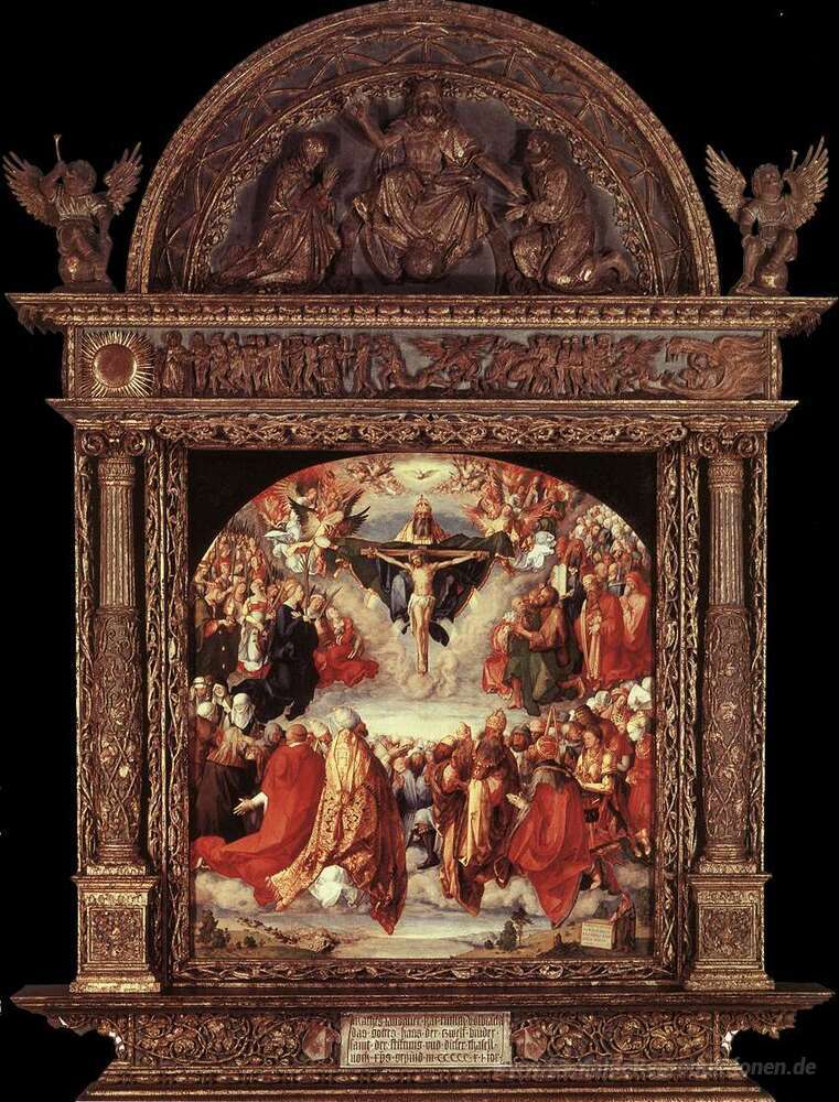 Wir bieten Ihnen eine handgefertigte Reproduktion auf Leinwand des berühmten Kunstwerks 'Die Anbetung der Heiligen Dreifaltigkeit (Landauer Altar)' von Albrecht Durer, aus dem Reproduktionsmuseum.