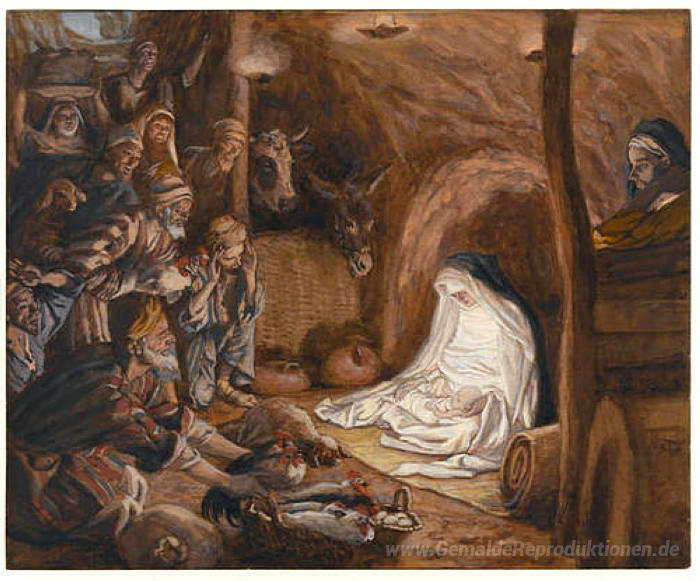 Wir bieten Ihnen eine handgefertigte Reproduktion auf Leinwand des berühmten Kunstwerks 'Die Anbetung der Hirten, Illustration für 'das Leben Christi'' von James Tissot, aus dem Reproduktionsmuseum.