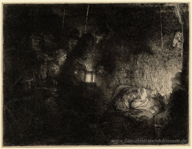 Wir bieten Ihnen eine handgefertigte Reproduktion auf Leinwand des berühmten Kunstwerks 'Die Anbetung der Hirten' von Rembrandt, aus dem Reproduktionsmuseum.