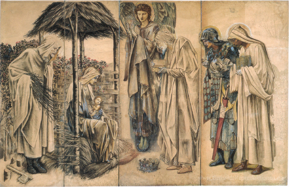 Wir bieten Ihnen eine handgefertigte Reproduktion auf Leinwand des berühmten Kunstwerks 'Die Anbetung der Könige' von Edward Burne-Jones, aus dem Reproduktionsmuseum.