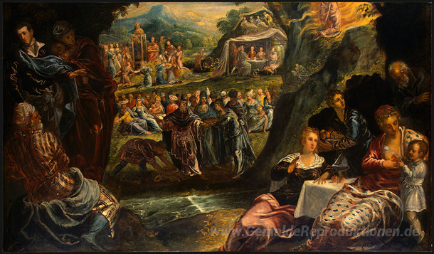 Wir bieten Ihnen eine handgefertigte Reproduktion auf Leinwand des berühmten Kunstwerks 'Die Anbetung des Goldenen Kalbes' von Tintoretto, aus dem Reproduktionsmuseum.