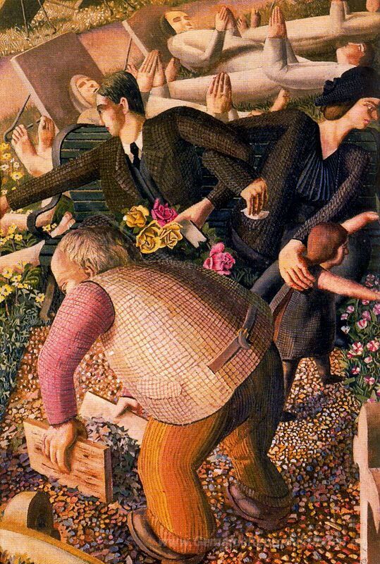 Wir bieten Ihnen eine handgefertigte Reproduktion auf Leinwand des berühmten Kunstwerks 'Die Auferstehung - Waking Up 2' von Stanley Spencer, aus dem Reproduktionsmuseum.