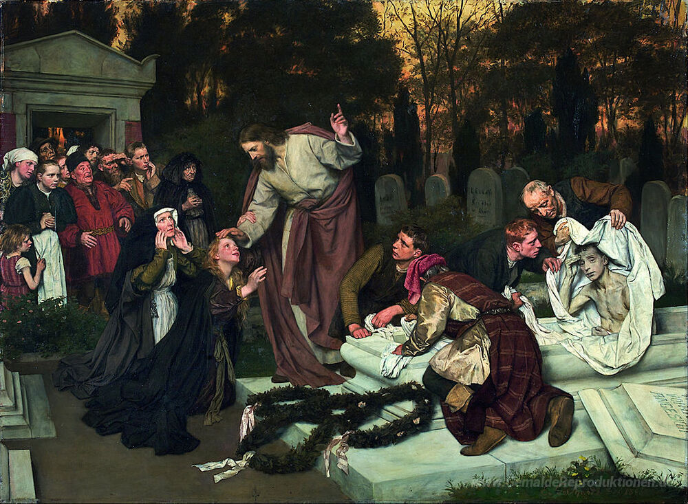 Wir bieten Ihnen eine handgefertigte Reproduktion auf Leinwand des berühmten Kunstwerks 'Die Auferweckung des Lazarus' von Eduard von Gebhardt, aus dem Reproduktionsmuseum.