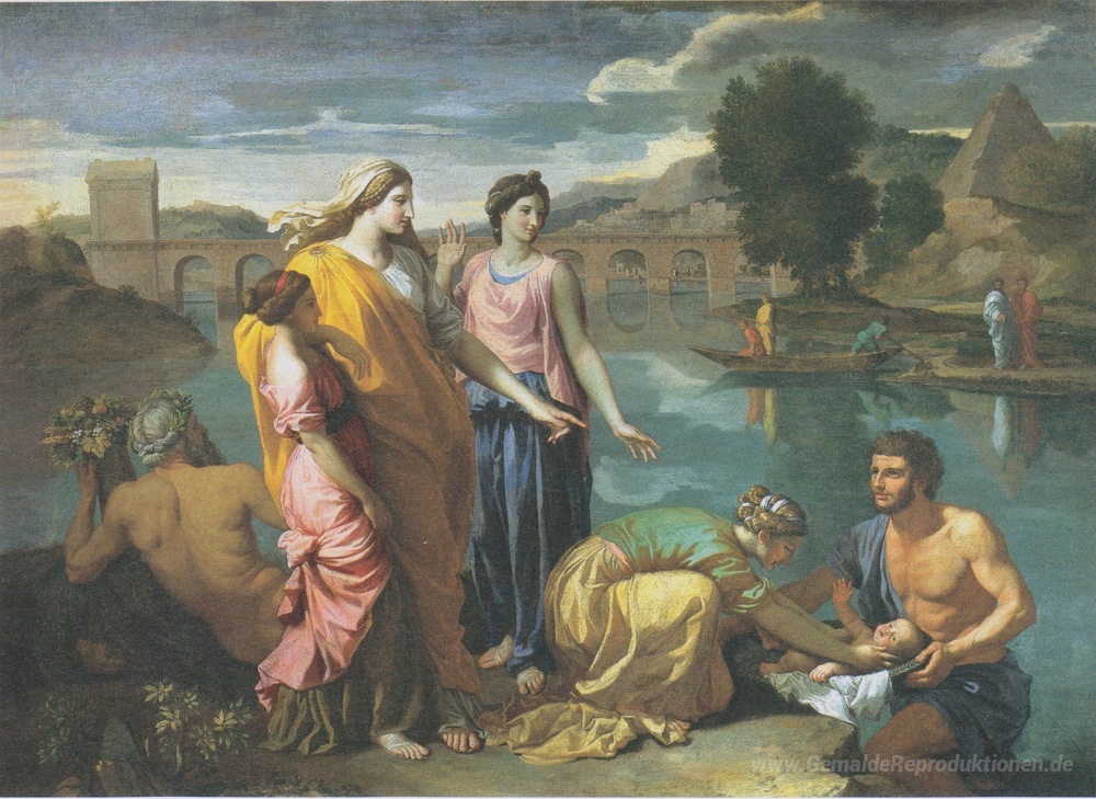 Wir bieten Ihnen eine handgefertigte Reproduktion auf Leinwand des berühmten Kunstwerks 'Die Auffindung des Mosesknaben' von Nicolas Poussin, aus dem Reproduktionsmuseum.
