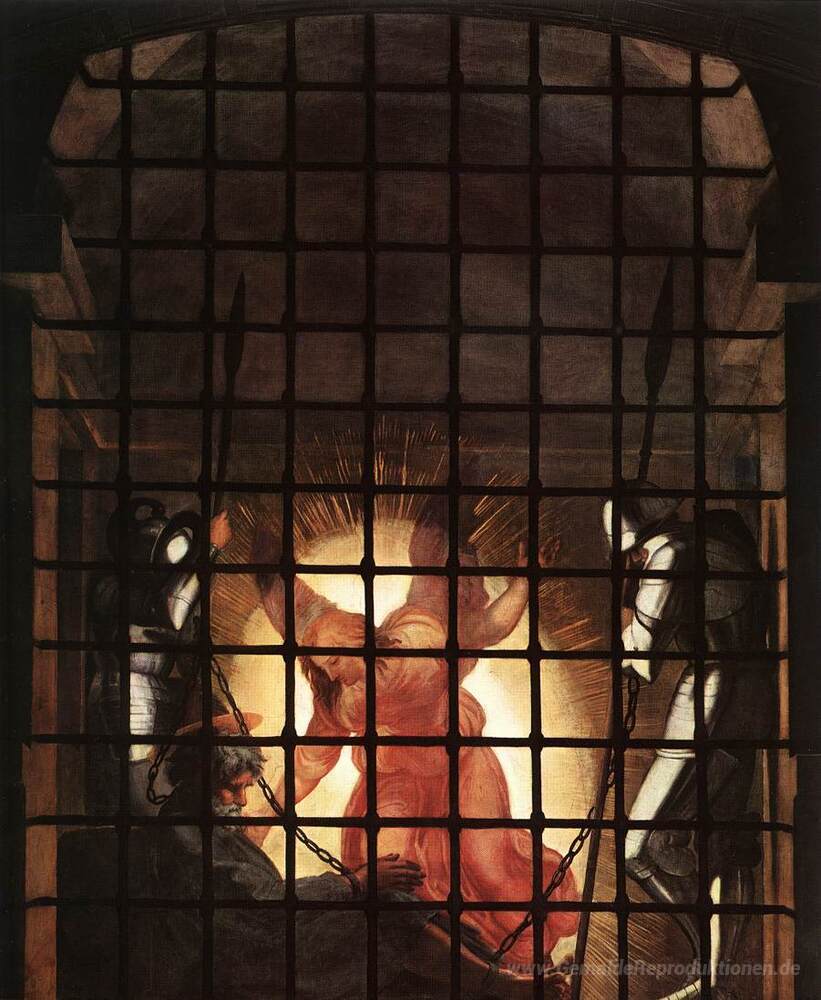 Wir bieten Ihnen eine handgefertigte Reproduktion auf Leinwand des berühmten Kunstwerks 'Die Befreiung von St. Peter, in der Stanza D'Eliodoro' von Raphael, aus dem Reproduktionsmuseum.