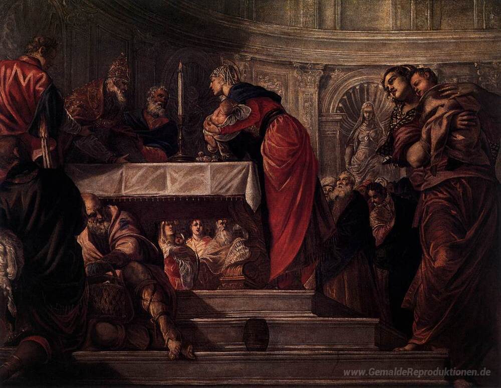 Wir bieten Ihnen eine handgefertigte Reproduktion auf Leinwand des berühmten Kunstwerks 'Die Darstellung von Christus im Tempel' von Tintoretto, aus dem Reproduktionsmuseum.
