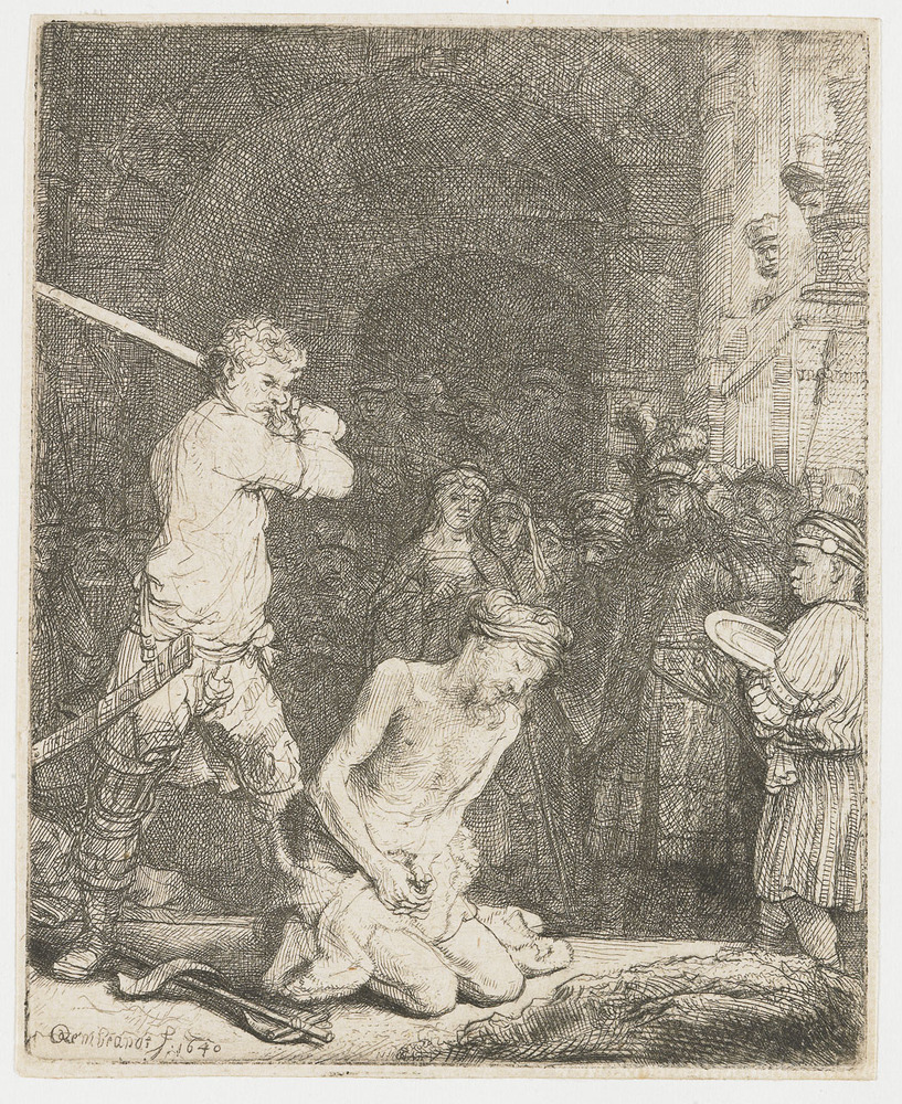 Wir bieten Ihnen eine handgefertigte Reproduktion auf Leinwand des berühmten Kunstwerks 'Die Enthauptung Johannes des Täufers' von Rembrandt, aus dem Reproduktionsmuseum.