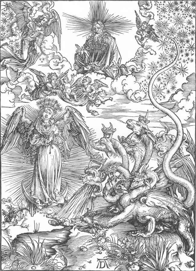 Wir bieten Ihnen eine handgefertigte Reproduktion auf Leinwand des berühmten Kunstwerks 'Die Frau mit der Sonne und dem siebenköpfigen Drachen bekleidet' von Albrecht Durer, aus dem Reproduktionsmuseum.