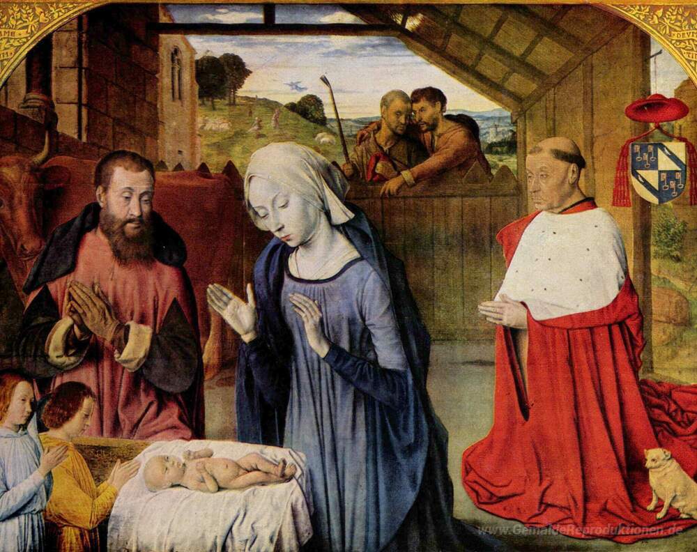 Wir bieten Ihnen eine handgefertigte Reproduktion auf Leinwand des berühmten Kunstwerks 'Die Geburt Christi' von Jean Hey, aus dem Reproduktionsmuseum.