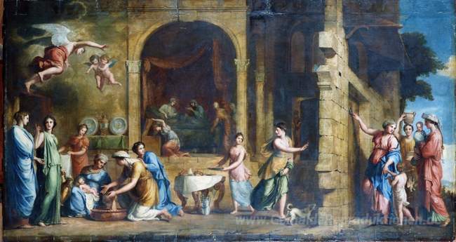 Wir bieten Ihnen eine handgefertigte Reproduktion auf Leinwand des berühmten Kunstwerks 'Die Geburt der Jungfrau' von Jacques Stella, aus dem Reproduktionsmuseum.