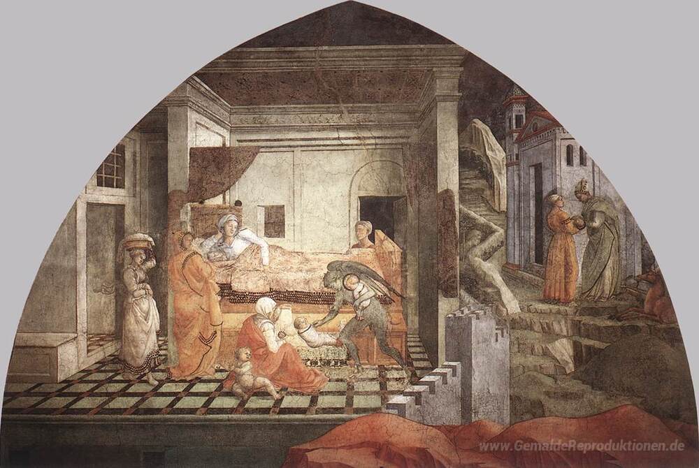 Wir bieten Ihnen eine handgefertigte Reproduktion auf Leinwand des berühmten Kunstwerks 'Die Geburt und Kindheit von St. Stephan' von Filippo Lippi, aus dem Reproduktionsmuseum.