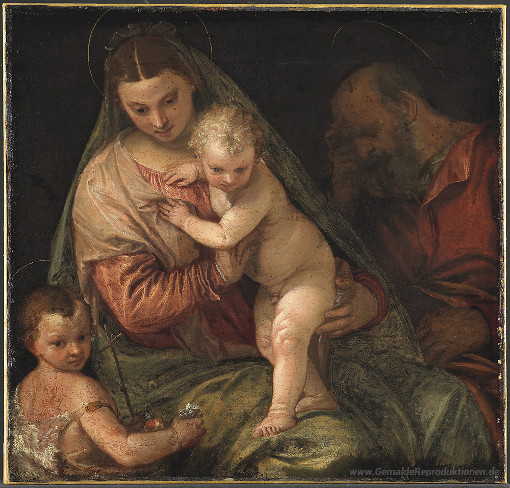 Wir bieten Ihnen eine handgefertigte Reproduktion auf Leinwand des berühmten Kunstwerks 'Die Heilige Familie mit dem Jesuskind St. Johannes der Täufer' von Paolo Veronese, aus dem Reproduktionsmuseum.