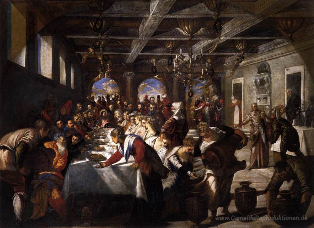 Willkommen in der Welt der Ölgemälde, in der Meisterwerke zeitloser Schönheit auf immer währende Emotionen treffen. Eines dieser beeindruckenden Werke ist Die Hochzeit zu Kana, geschaffen von dem venezianischen Künstler Tintoretto. Mit seinem einzigartigen Stil, der dynamische Kompositionen und lebendige Farben kombiniert, zieht Tintoretto den Betrachter in eine faszinierende Erzählung hinein, die das Fest der Hochzeit in all seiner Pracht darstellt.