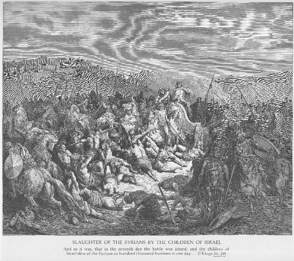 Wir bieten Ihnen eine handgefertigte Reproduktion auf Leinwand des berühmten Kunstwerks 'Die Israeliten Slaughter die Syrer' von Gustave Dore, aus dem Reproduktionsmuseum.