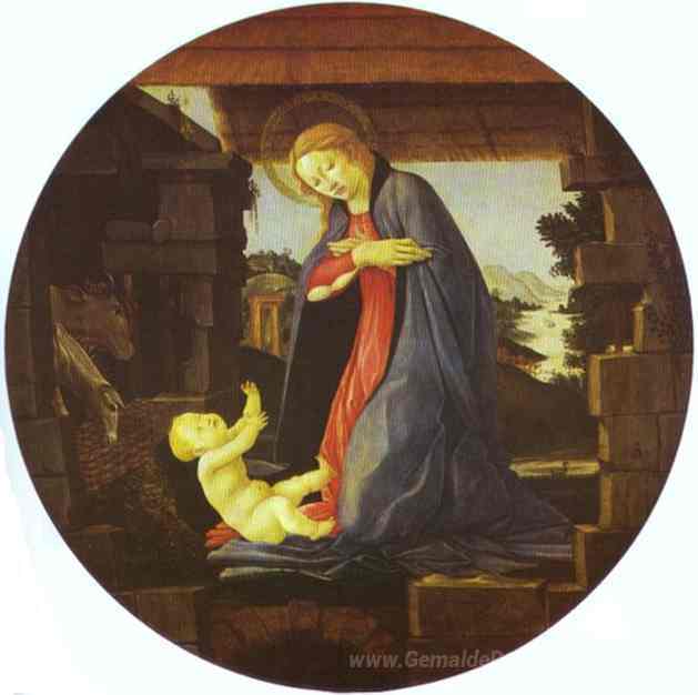 Wir bieten Ihnen eine handgefertigte Reproduktion auf Leinwand des berühmten Kunstwerks 'Die Jungfrau Anbetung des Kindes' von Sandro Botticelli, aus dem Reproduktionsmuseum.