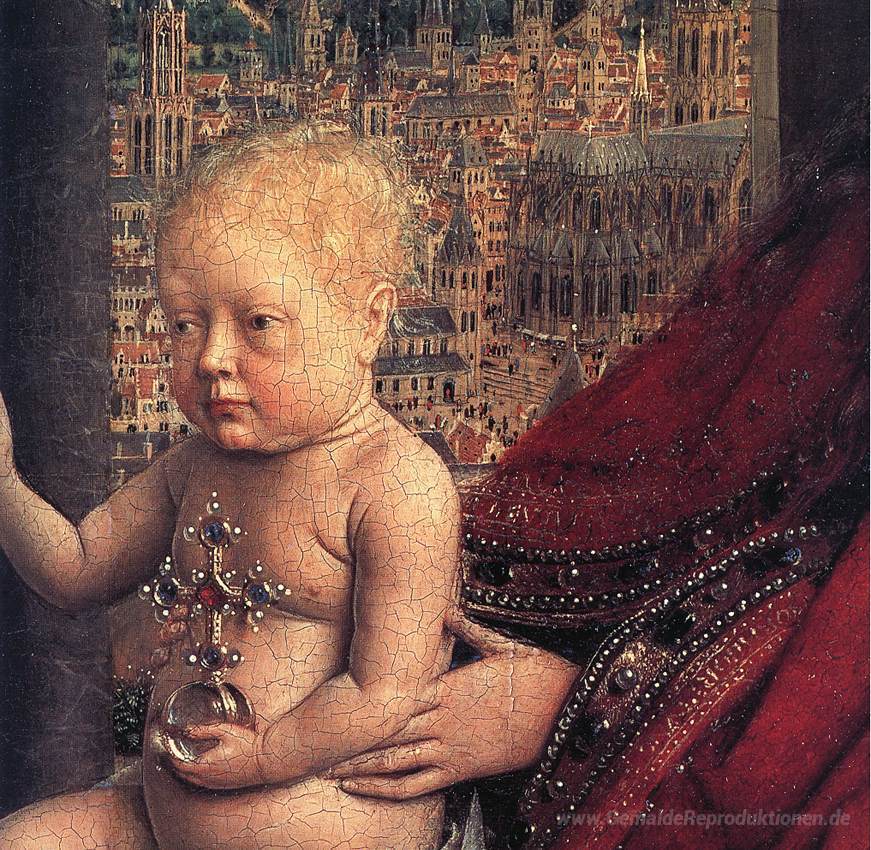 Wir bieten Ihnen eine handgefertigte Reproduktion auf Leinwand des berühmten Kunstwerks 'Die Jungfrau des Kanzlers Rolin (Detail)' von Jan van Eyck, aus dem Reproduktionsmuseum.