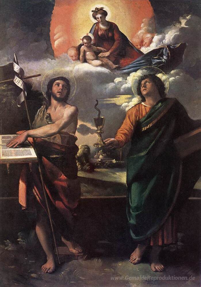 Wir bieten Ihnen eine handgefertigte Reproduktion auf Leinwand des berühmten Kunstwerks 'Die Jungfrau erscheint dem Heiligen Johannes dem Täufer und Joha' von Dosso Dossi, aus dem Reproduktionsmuseum.