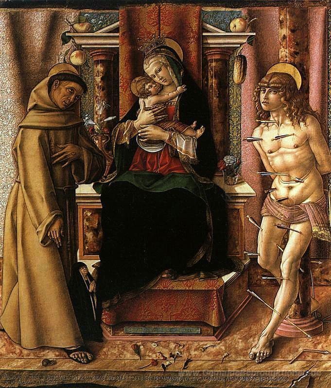 Wir bieten Ihnen eine handgefertigte Reproduktion auf Leinwand des berühmten Kunstwerks 'Die Jungfrau und das Kind mit den Heiligen Franz und Sebastian' von Carlo Crivelli, aus dem Reproduktionsmuseum.