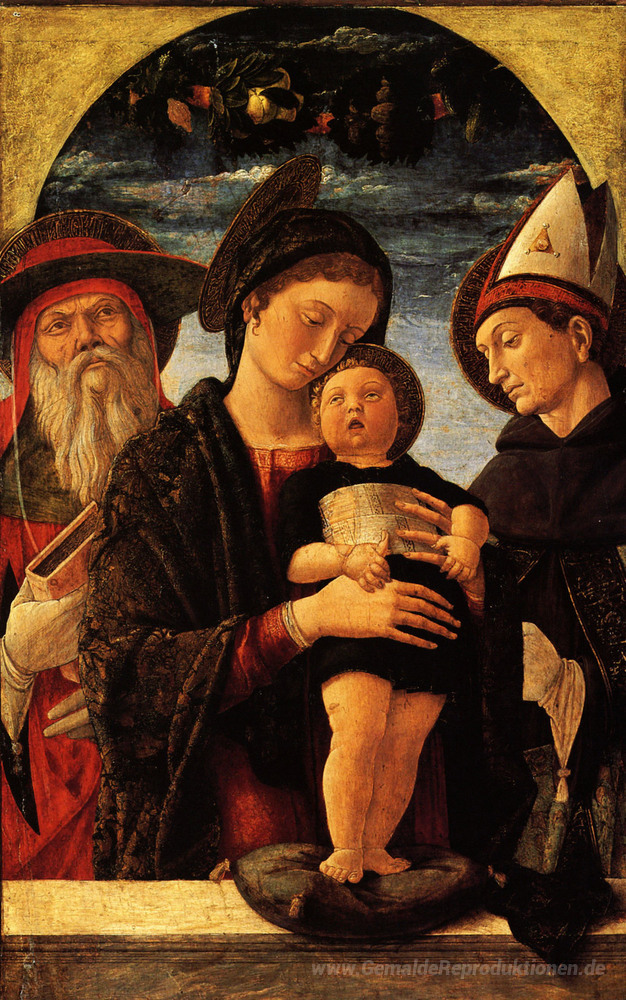 Wir bieten Ihnen eine handgefertigte Reproduktion auf Leinwand des berühmten Kunstwerks 'Die Jungfrau und Kind mit Heiligen Hieronymus und Ludwig von Tou' von Andrea Mantegna, aus dem Reproduktionsmuseum.