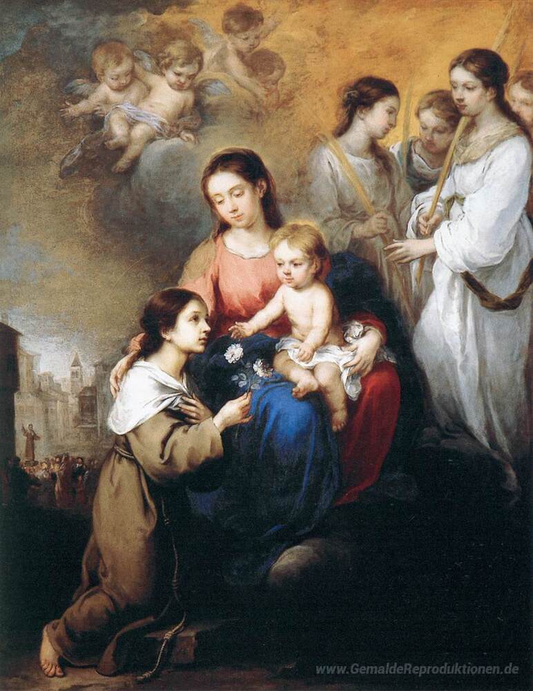 Wir bieten Ihnen eine handgefertigte Reproduktion auf Leinwand des berühmten Kunstwerks 'Die Jungfrau und Kind mit St. Rosalina' von Bartolome Esteban Murillo, aus dem Reproduktionsmuseum.