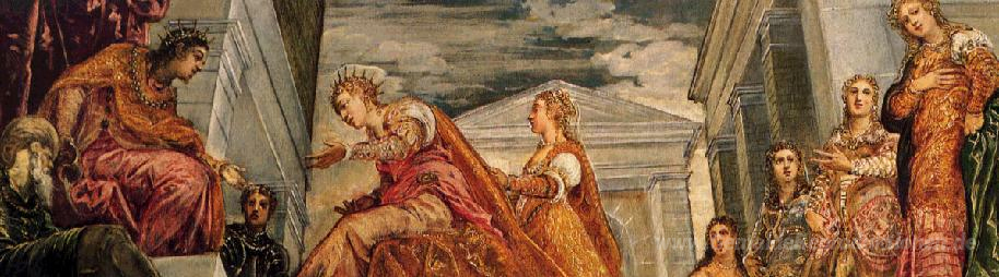 Wir bieten Ihnen eine handgefertigte Reproduktion auf Leinwand des berühmten Kunstwerks 'Die Königin von Saba und Salomo' von Tintoretto, aus dem Reproduktionsmuseum.