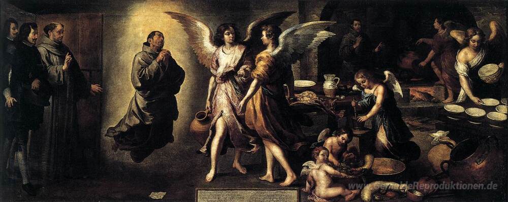 Wir bieten Ihnen eine handgefertigte Reproduktion auf Leinwand des berühmten Kunstwerks 'Die Küche der Engel' von Bartolome Esteban Murillo, aus dem Reproduktionsmuseum.