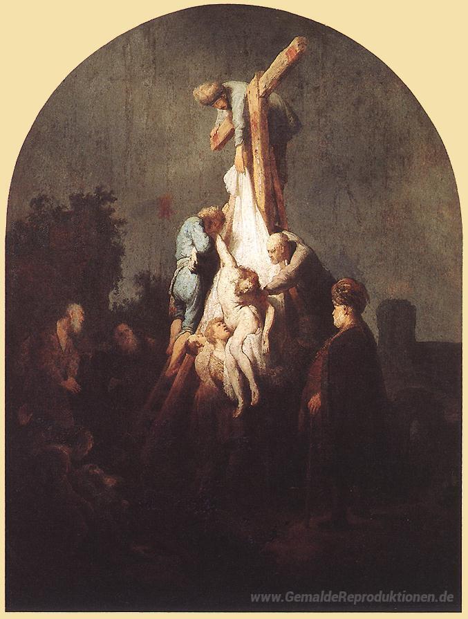 Wir bieten Ihnen eine handgefertigte Reproduktion auf Leinwand des berühmten Kunstwerks 'Die Kreuzabnahme' von Rembrandt, aus dem Reproduktionsmuseum.