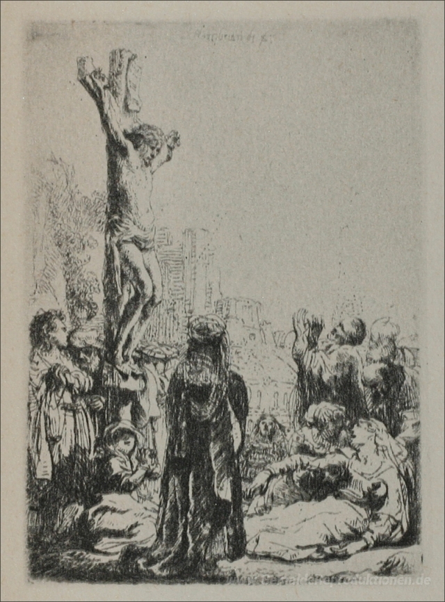 Wir bieten Ihnen eine handgefertigte Reproduktion auf Leinwand des berühmten Kunstwerks 'Die Kreuzigung ein Quadrat kleine Platte' von Rembrandt, aus dem Reproduktionsmuseum.