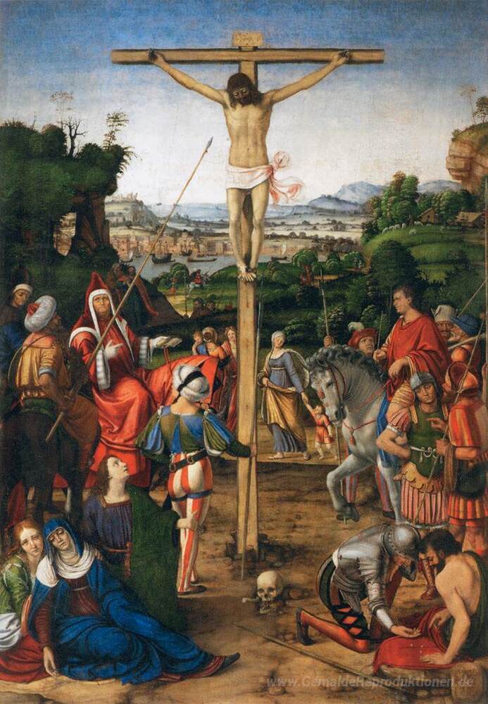 Wir bieten Ihnen eine handgefertigte Reproduktion auf Leinwand des berühmten Kunstwerks 'Die Kreuzigung' von Andrea Solario, aus dem Reproduktionsmuseum.
