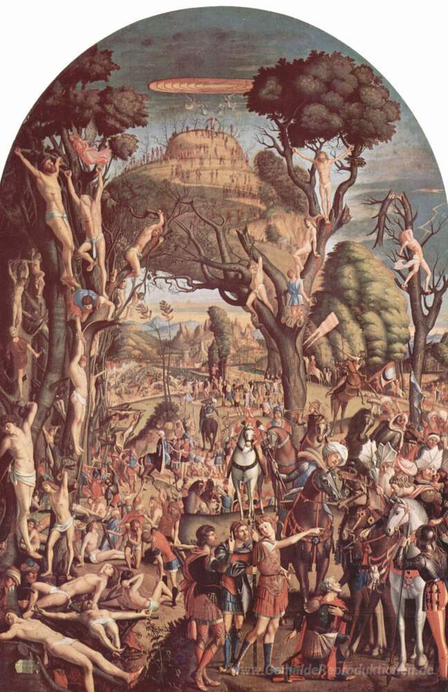 Wir bieten Ihnen eine handgefertigte Reproduktion auf Leinwand des berühmten Kunstwerks 'Die Kreuzigung und der Verherrlichung der Zehntausend Märtyrer a' von Vittore Carpaccio, aus dem Reproduktionsmuseum.