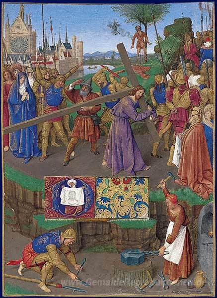 Wir bieten Ihnen eine handgefertigte Reproduktion auf Leinwand des berühmten Kunstwerks 'Die Kreuztragung' von Jean Fouquet, aus dem Reproduktionsmuseum.