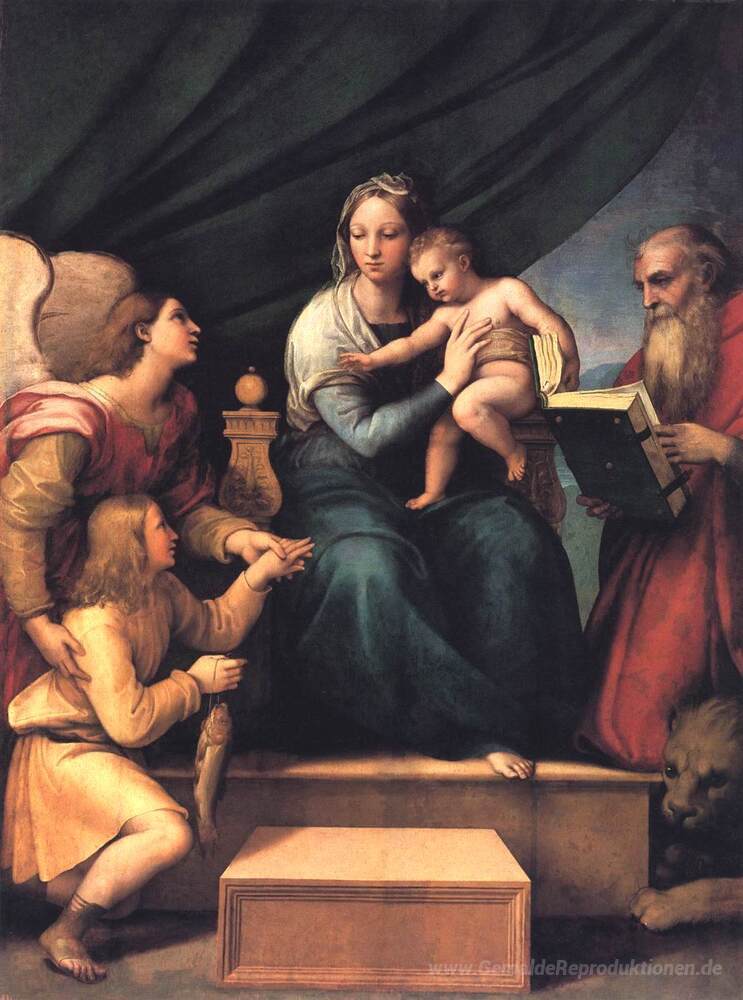 Wir bieten Ihnen eine handgefertigte Reproduktion auf Leinwand des berühmten Kunstwerks 'Die Madonna der Fische (das Madonna mit dem Erzengel Gabriel und' von Raphael, aus dem Reproduktionsmuseum.