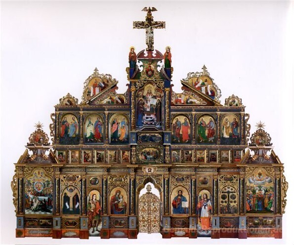 Wir bieten Ihnen eine handgefertigte Reproduktion auf Leinwand des berühmten Kunstwerks 'Die Maniava Hermitage Ikonostase' von Yov Kondzelevych, aus dem Reproduktionsmuseum.