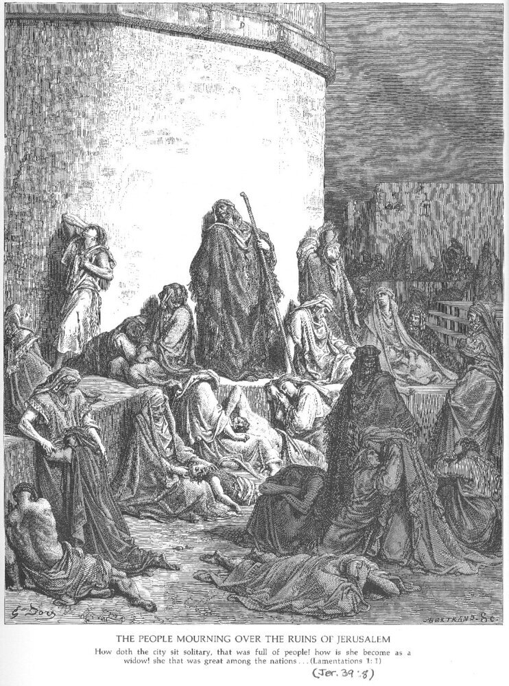 Wir bieten Ihnen eine handgefertigte Reproduktion auf Leinwand des berühmten Kunstwerks 'Die Menschen Trauer über den Ruinen von Jerusalem, Klagelieder 1' von Gustave Dore, aus dem Reproduktionsmuseum.