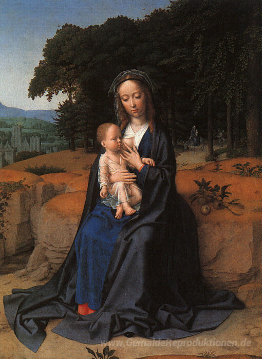 Wir bieten Ihnen eine handgefertigte Reproduktion auf Leinwand des berühmten Kunstwerks 'Die Ruhe auf der Flucht nach Ägypten' von Gerard David, aus dem Reproduktionsmuseum.
