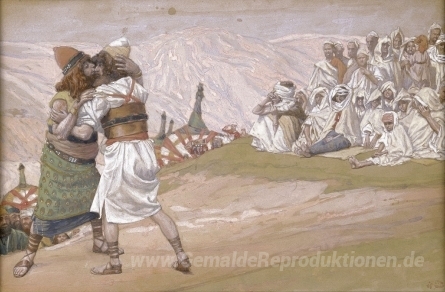 Wir bieten Ihnen eine handgefertigte Reproduktion auf Leinwand des berühmten Kunstwerks 'Die Sitzung von Esau und Jakob' von James Tissot, aus dem Reproduktionsmuseum.