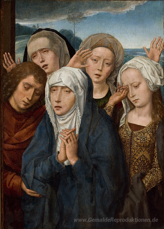 Wir bieten Ihnen eine handgefertigte Reproduktion auf Leinwand des berühmten Kunstwerks 'Die Trauer Jungfrau mit St. John und die frommen Frauen aus Gali' von Hans Memling, aus dem Reproduktionsmuseum.