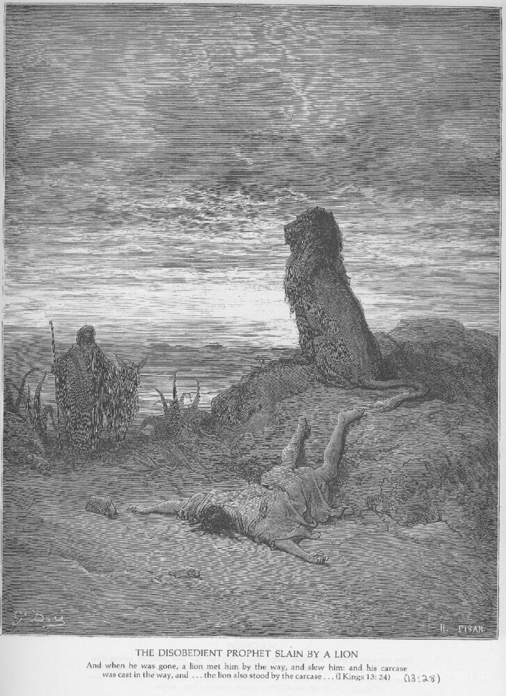 Wir bieten Ihnen eine handgefertigte Reproduktion auf Leinwand des berühmten Kunstwerks 'Die Ungehorsamen Prophet ist von einem Löwen erschlagen' von Gustave Dore, aus dem Reproduktionsmuseum.