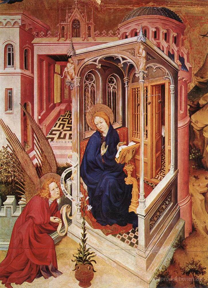 Wir bieten Ihnen eine handgefertigte Reproduktion auf Leinwand des berühmten Kunstwerks 'Die Verkündigung (aus Altar von Philip das mutige)' von Melchior Broederlam, aus dem Reproduktionsmuseum.
