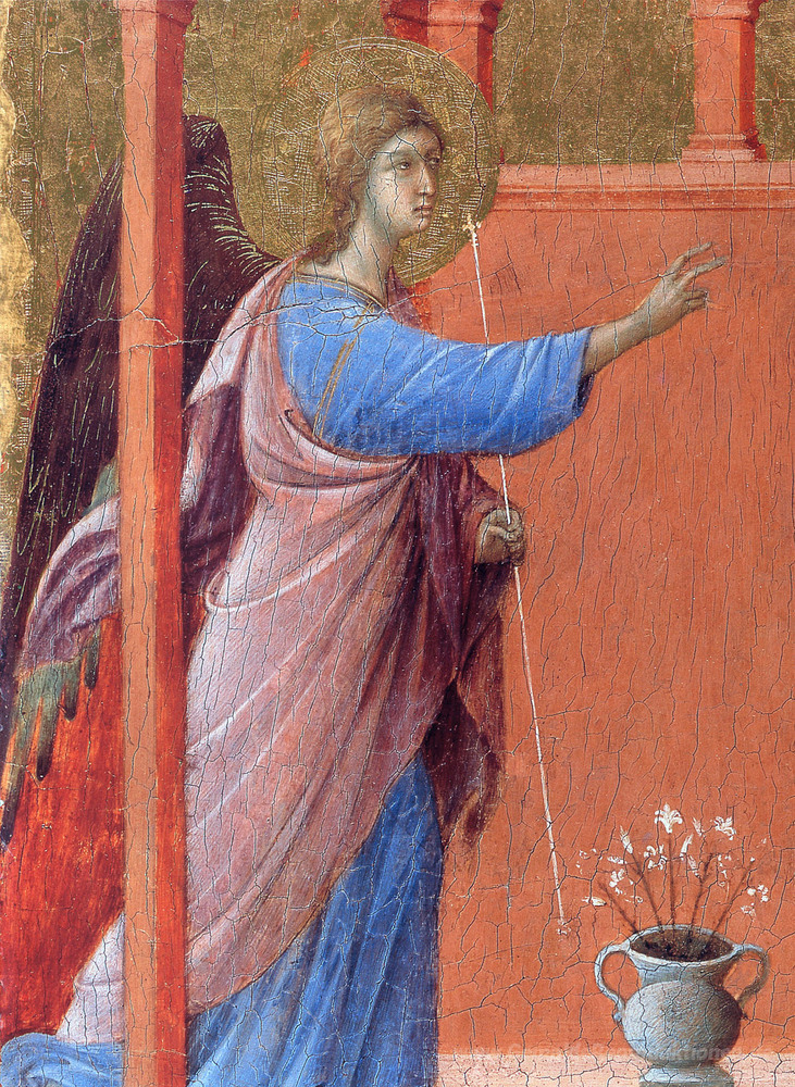 Wir bieten Ihnen eine handgefertigte Reproduktion auf Leinwand des berühmten Kunstwerks 'Die Verkündigung (Fragment)' von Duccio, aus dem Reproduktionsmuseum.
